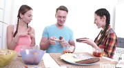 Две студентки соблазнили друга на тройничок, срывая одежду. Их сиськи дразнили его, пока член не встал колом. Сучки жадно сосали ствол по гланды, пуская слюни. По очереди подставляли мокрые киски, визжали от траха в разных позах. Похоть захлестнула их, оргазмы накрыли тела. Сперма брызнула на дойки. Кадры поймали липкие сиськи и хрипы. В финале телки слизали капли с груди, стоня от экстаза.